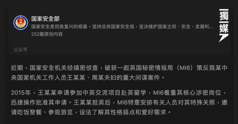 中共国家安全部のWeiboのは発表により、逮捕した二人は以前英国での留学経験者で、留学中に英国情報機関に吸収された。帰国後中国の「重要政府機関」で仕事しながら、英国情報機関の代理人に相場より高い金額の「コンサルタント業務」を提供し、中国国内情報を英国の情報機関MI6に横流しした。
